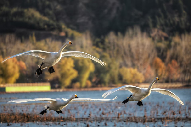 天鹅在引黄调蓄湖振翅高飞。(王建辉 摄)